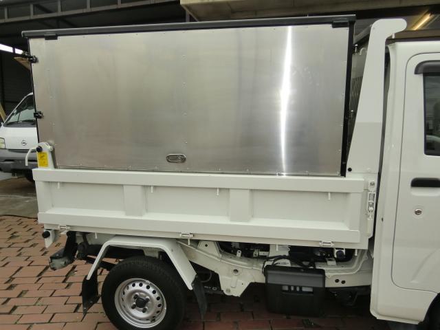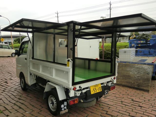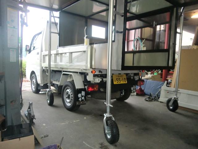 中に材料や道具、設備類を積んだままで軽トラック(ダンプ)から